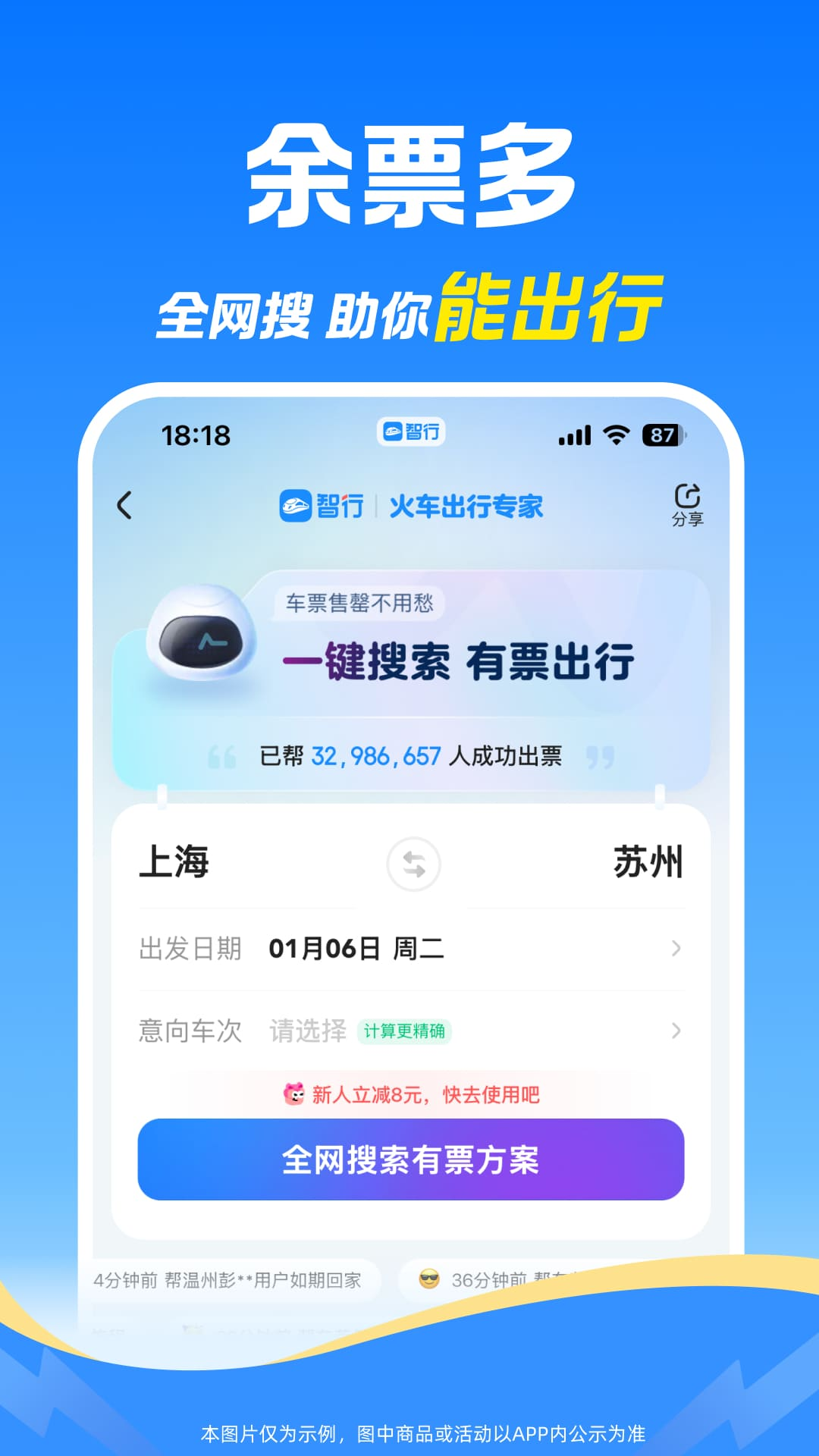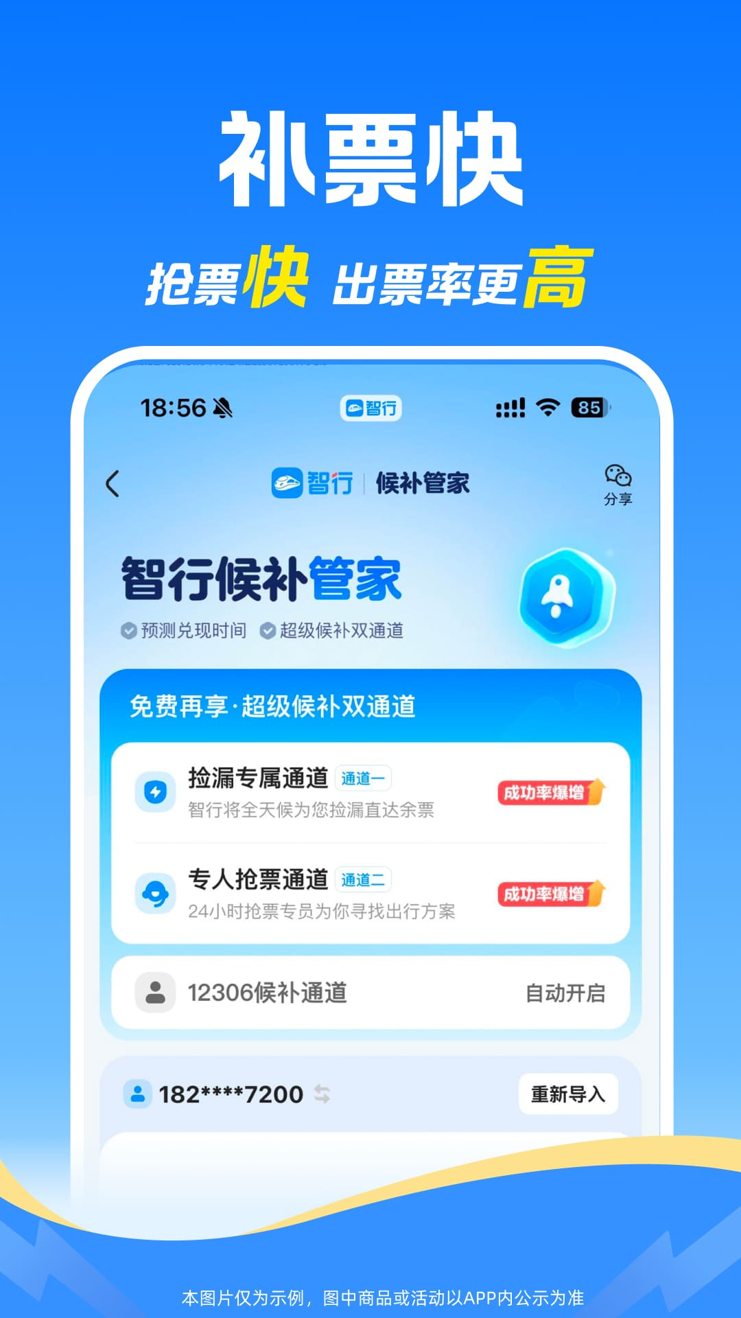 智行火车票(12306官方出票)-火车票、机票、酒店、汽车票、门票、船票一站式出行预订平台。 出行神器,提供火车开售时间、正晚点、候补人数查询等一站式出行服务,功能全面助您旅途顺心! 主要产品与服务: 【火车票】 [线上选座] - 在线选择心仪座位,下铺、靠窗随心选。 [免费车票] - 积分兑车票,0元免费坐火车。 [自动抢票] - 可提前预约下单,开售时自动出票;不仅抢候补,也能抢余票。 [24小时抢] - 可全天24小时抢票,有专人帮抢,成功率高,抢不到就敢赔。 [抢票福利] - 靠窗、下铺抢,学生还有全年抢票福利,抢不到升坐席。 [余票捡漏] - 各条线路隐藏余票一键检索,监控,即刻解决无票难题。 【特价机票】 买机票,先来智行比价,全球低价尽在智行。 【低价酒店】 独家功能,低价监控,有房监控,还可以帮您跟商家还价,低价不错过。