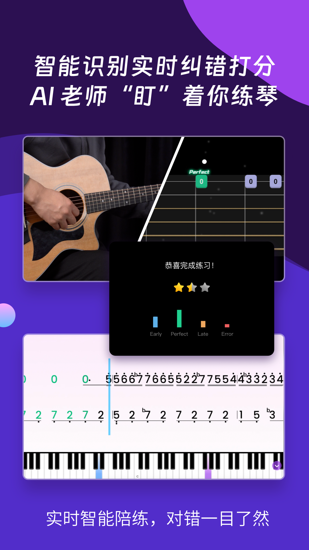 AI音乐学园-真实还原线下吉他、尤克里里、钢琴、声乐等多种乐器的一对一教学体验,采用先进的乐音识别及 AI 互动视频教学技术,可以智能评测您的演奏,实时调整您的学习内容,实现个性化的教学。让零基础小白都能轻松学会吉他、尤克里里、钢琴等多种乐器演奏和弹唱,让您的音乐成长之路更加简单、高效!