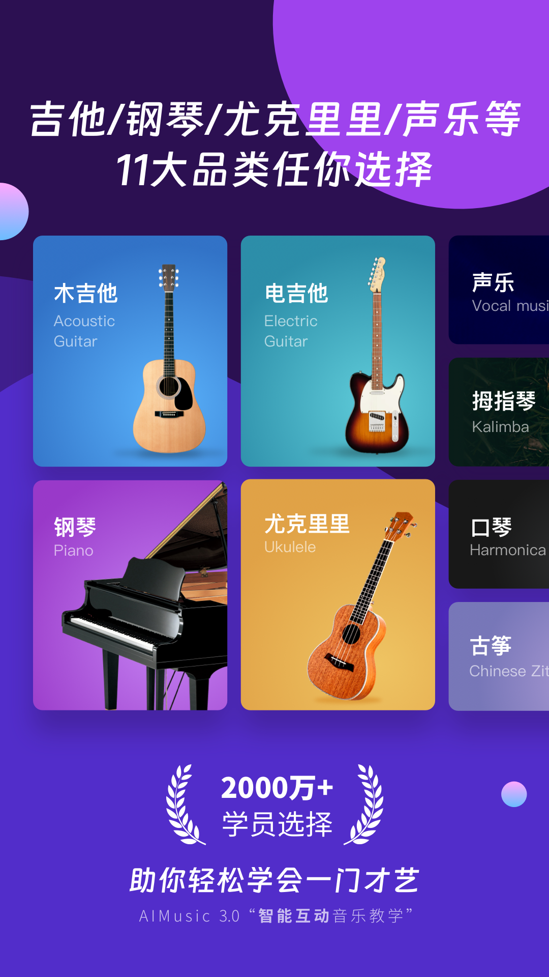 自2017年上线以来,为超过1000万学员提供了教学服务,不论是吉他、尤克里里、钢琴、拇指琴、口琴还是古筝、非洲鼓,AI音乐学园356天无休陪伴在您的左右,助力您的大神成长之路,遇见更好的自己!