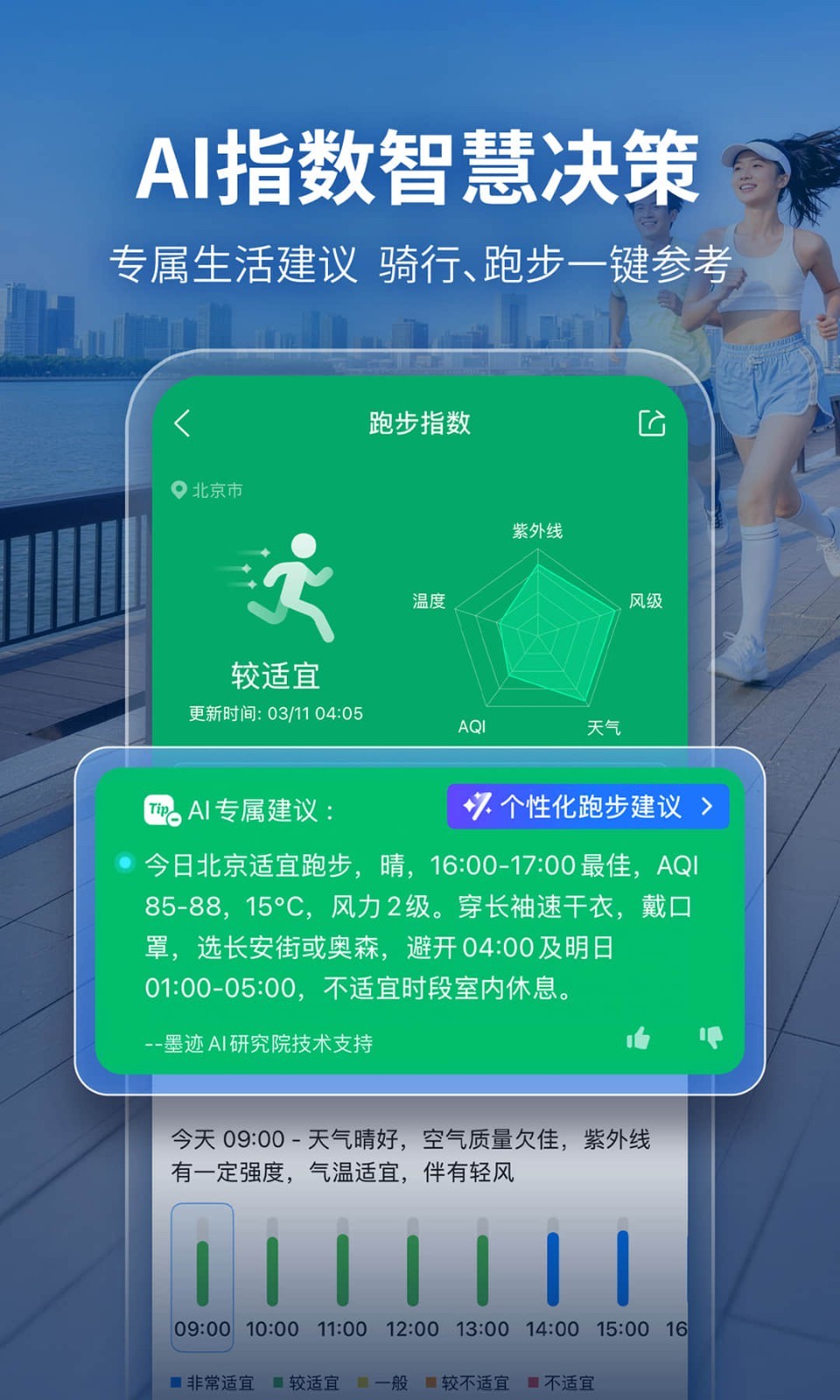 【AI指数】覆盖运动、骑行、洗车、跑步场景,结合小时级天气数据与大模型,清晰展示未来24小时每个时段的适宜程度,并给出专属建议与智能提醒,为您的户外生活提供智能决策。