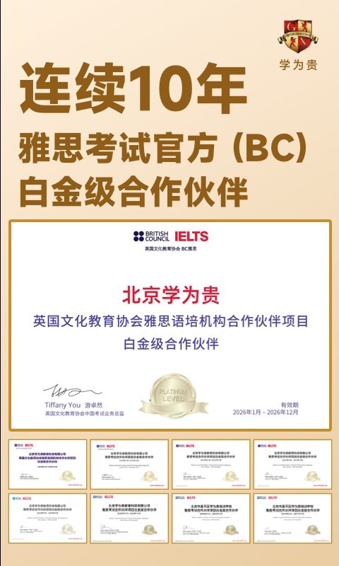 学为贵教育连续10年荣获雅思考试官方授予的白金级合作伙伴荣誉称号,拥有独创的雅思真经教学体系GETS,雅思教父刘洪波、雅思王王陆等众多教学经验丰富的老师都在这里。