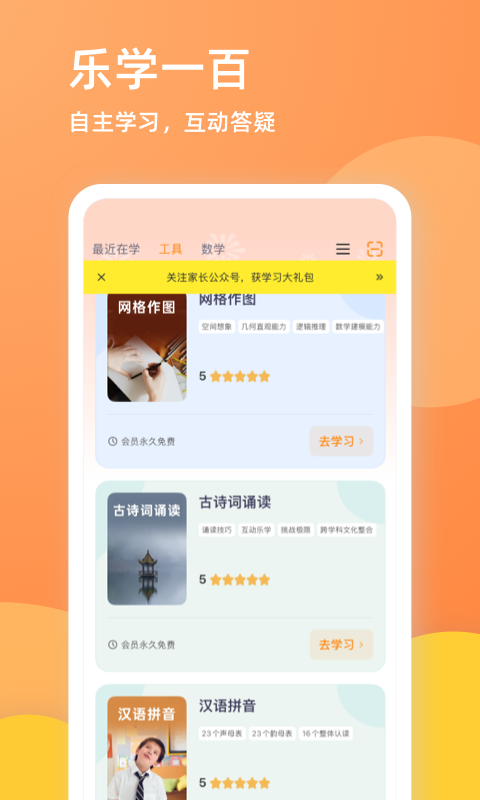 乐学一百是一款专注于中小学在线教育的学习APP,致力于激发孩子学习潜能,培养自主学习能力。基于20年多媒体教学经验与全球在线教育研究成果,研发出适配中小学生的3I 教学法(互动式、渐进式、自适应),涵盖同步课程、能力拓展与专项训练。