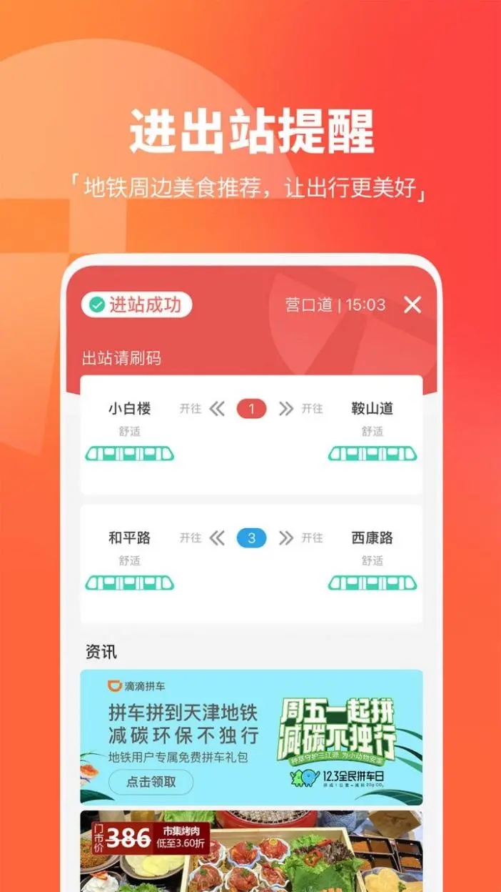 天津地铁官方APP正式上线啦。有了这款地铁出行APP,您无需先购票再乘车,登录天津地铁APP,实名绑卡后生成专属乘车码,对准闸机“二维码扫码口”轻轻一扫,就可以轻松进出站,而且是先乘车后付费哦~