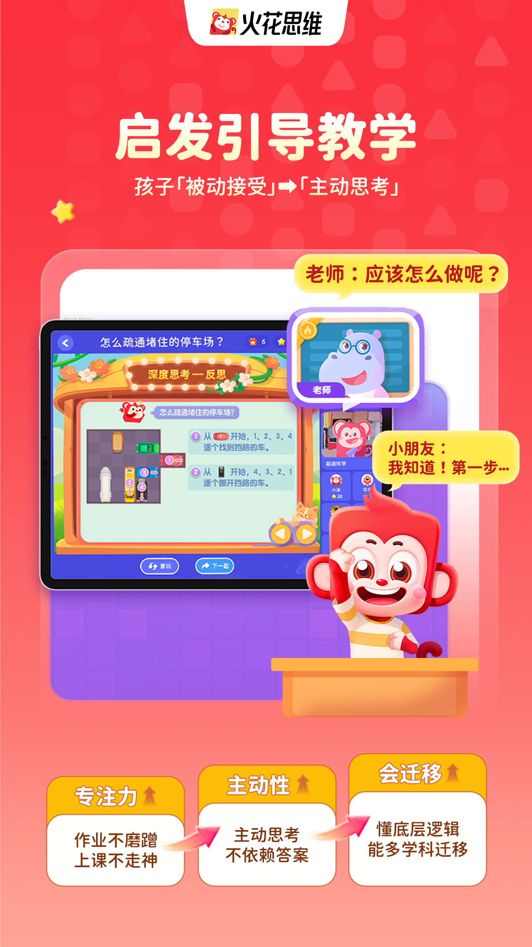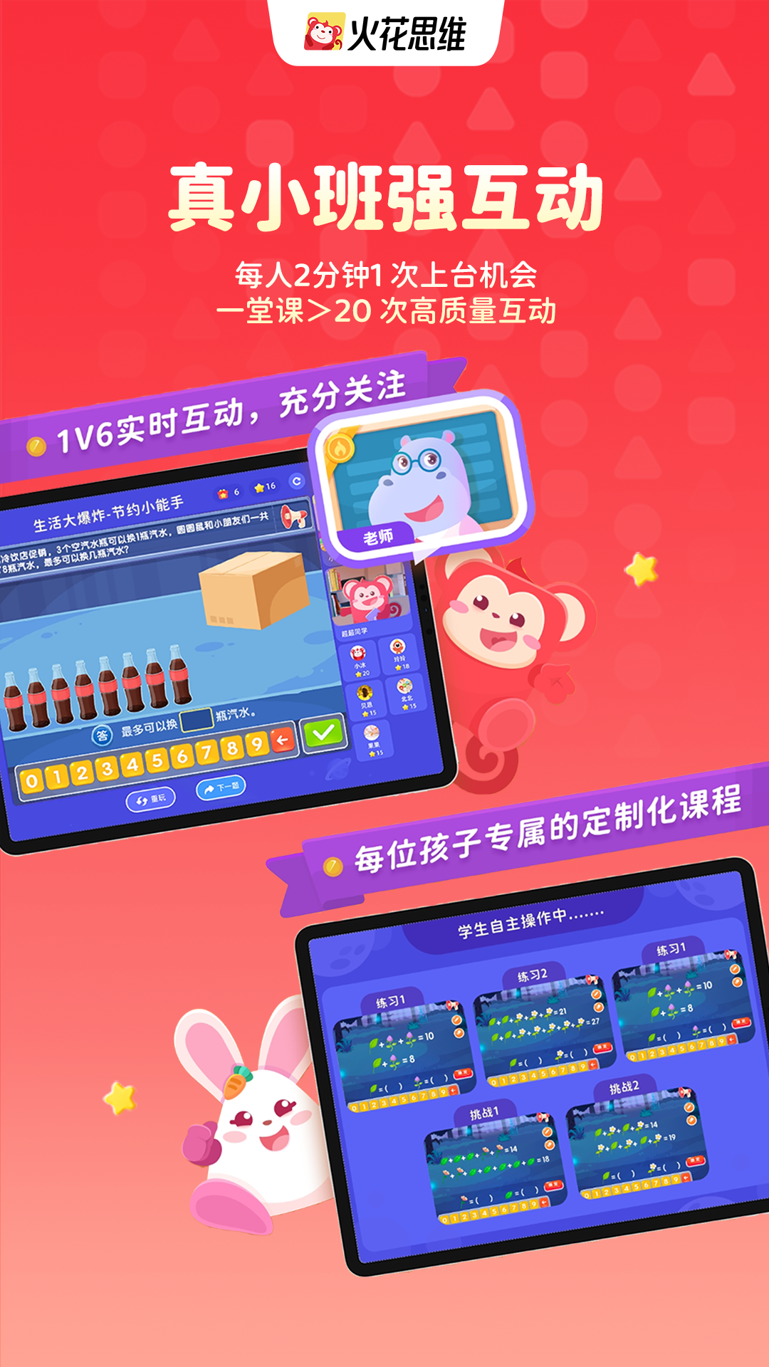火花通过小班教学关注到每个孩子,通过”动态分层“让孩子保持“够一够就能学会”的状态;通过形象化教法,激发孩子兴趣,降低孩子对新知的认知门槛,提升孩子的理解能力;通过四步“启发式”教学法,引导孩子独立思考,探索过程、理解本源,实现会思考,会迁移,学会独立解决问题,建立终身受益的自信心。