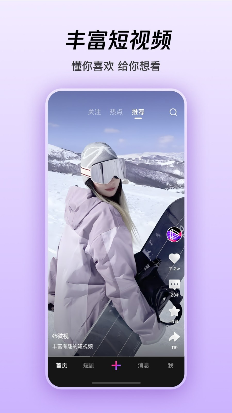 腾讯微视是腾讯旗下短视频app。提供海量的热门优质视频,让每个用户都能在这里发现喜欢的内容。无论是关注社会热点、学习生活妙招、发现小众兴趣、观看影视解说、追热门短剧,在这里都可以得到满足。